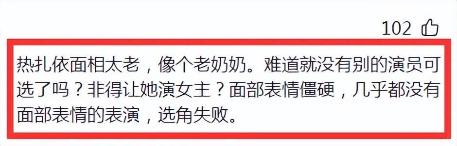 更有网友吐槽,“热依扎面相太老,像个老奶奶。难说念就莫得别的演员可选了吗?非得让她演女主?面部神色僵硬,果真都莫得面部神色的饰演,选角失败”。