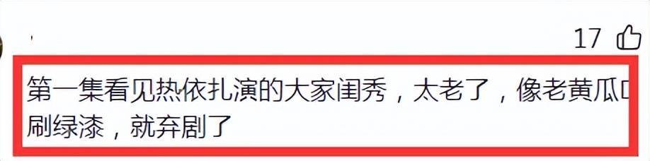 有网友说,“第一集看见热依扎演的众人闺秀,太老了,像老黄瓜刷绿漆,就弃剧了”。