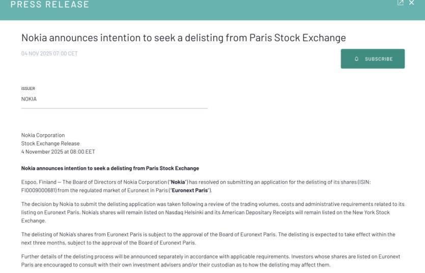 诺基亚通知央求从巴黎泛欧交往所退市开云kaiyun.com。