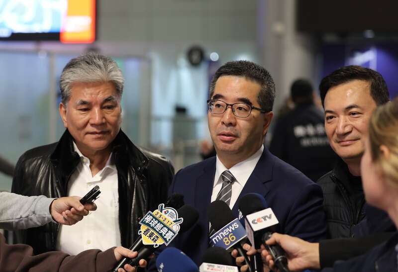 2月2日,中国国民党副主席萧旭岑率团起程赶赴大陆,投入行将在北京举行的“国共两党智库论坛”。图为萧旭岑(中)启航前在桃园机场会见媒体。视觉中国供图