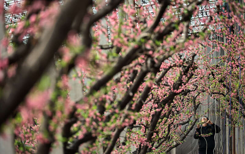 2月4日,山西新绛,立春时节,当地油桃大棚内桃花怒放,诱导蜜蜂采蜜。新绛县是华北地区弥留的油桃产地,当地桃农正忙于管护,以确保油桃在4月底至5月初上市。视觉中国供图