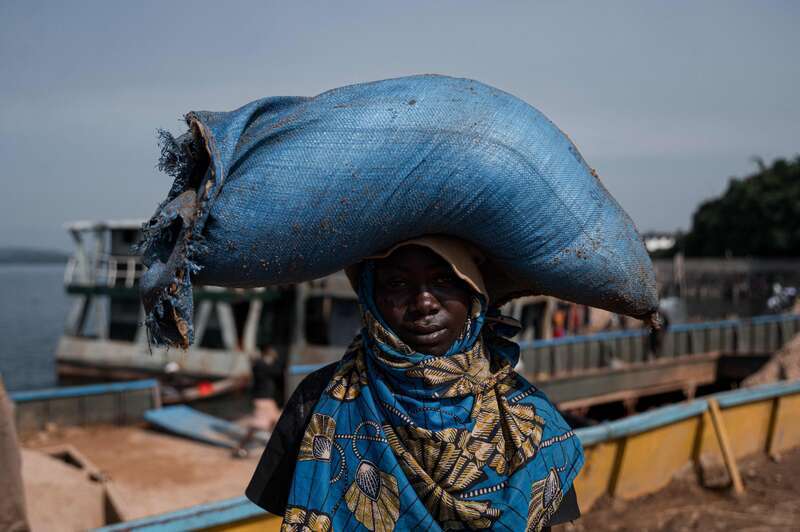 当地时候1月23日,刚果(金)戈马,25岁的克里斯蒂安·坎巴莱加入当地年青劳工队列,在基图库口岸从卢旺达一侧的基伍湖运来的货船上卸下沙袋。他每天的工资是1万刚果法郎,约合5好意思元。视觉中国供图